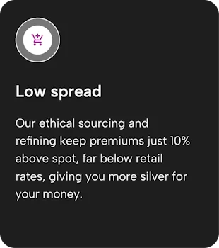 Silver is purchased at spot + 10% to cover refining, storage, audits and compliance costs. Cashouts are paid at the current silver spot price. If the silver price has risen since your purchase, your vault value may be higher than your purchase price.