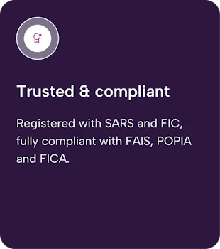 Yes. We are registered with SARS and FIC and fully compliant with FAIS, POPIA and FICA requirements.